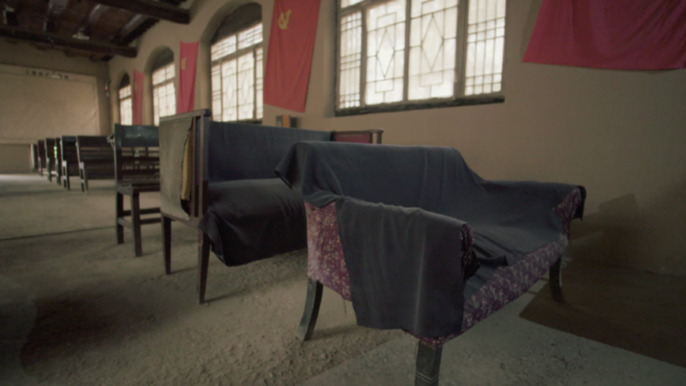會場前面放置的長條椅是當(dāng)年的原物,長條椅的數(shù)量很少,只有兩個,還有四個沙發(fā)。這四個沙發(fā)也是在戰(zhàn)場上繳獲的戰(zhàn)利品。參會的代表中,中央委員34位,中央候補委員19位,還有11位列席人員,總共64位代表。他們當(dāng)時是怎么坐呢?沒有固定位置。到會早、年齡長的代表,前面的沙發(fā)、長條椅隨便坐,來的晚的領(lǐng)導(dǎo)都是自帶小板凳、小馬扎,有的領(lǐng)導(dǎo)帶著帆布躺椅來開會。在九天的會議期間,代表們每天坐的位置都是不一樣的。