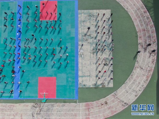 在青海省玉樹藏族自治州八一孤兒學(xué)校,學(xué)生們在進(jìn)行課間活動(4月3日攝,無人機(jī)照片)。新華社記者 張龍 攝