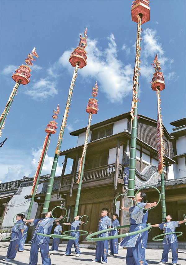 建瓯挑幡是福建省建瓯市的民间绝活,是国家级非物质文化遗产代表性项目之一。经过传承发展,建瓯挑幡如今有了多种形式的表演队伍,经常在各大活动中展示。图为2023年12月6日,演出队伍在历史文化街区表演建瓯挑幡。 福建日报社供图 游庆辉/摄