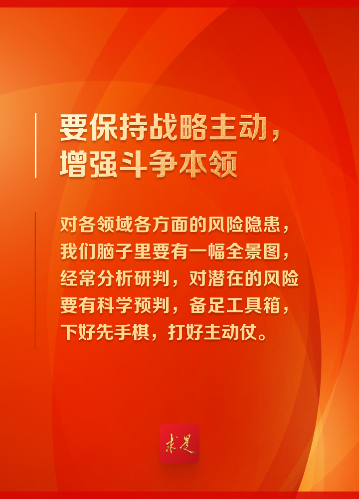 “推进中国式现代化,是一项前无古人的开创性事业,必然会遇到各种可以预料和难以预料的风险挑战、艰难险阻甚至惊涛骇浪,必须增强忧患意识,坚持底线思维,居安思危、未雨绸缪,敢于斗争、善于斗争,通过顽强斗争打开事业发展新天地。”
