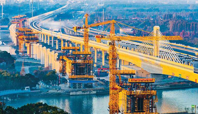 我国是唯一拥有联合国产业分类中全部工业门类的国家,制造业增加值连续14年稳居世界第一。图为2024年12月2日,位于上海市青浦区金泽镇的示范区线跨拦路港大桥建设有序推进,这是目前国内市域铁路最大跨度无砟轨道连续混合梁桥。 中新社发 钟鑫旺/摄