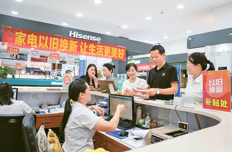 2024年,我国推出“两重”、“两新”政策,着力扩大国内需求。截至2024年12月13日零时,消费品以旧换新政策整体带动相关产品销售额超1万亿元。图为9月24日,在湖南省汨罗市天虹电器城,市民积极参与以旧换新活动。 新华社记者 陈思汗/摄