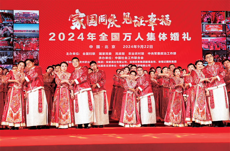 2024年9月22日,全国妇联联合有关部门在全国各地50个会场,同步举办“家国同庆 见证幸福”2024年全国万人集体婚礼。新人代表发出了争做中华家庭美德的传承者、新型婚育文化的引领者、社会主义家庭文明新风尚的践行者倡议。图为新人们在北京主会场拍照留念。 新华社记者 张玉薇/摄