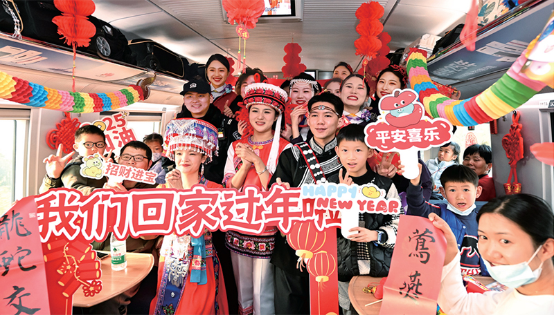 农历小年来临之际,上海客运段高铁四车队在由上海虹桥站发往厦门北站的G1653次列车上举办“中国年,民族情,齐聚高铁过小年”主题活动,让旅客在旅途中感受浓厚的节日氛围。图为2025年1月21日,铁路上海客运段职工与旅客在车厢里合影。 新华社发 陈浩明/摄