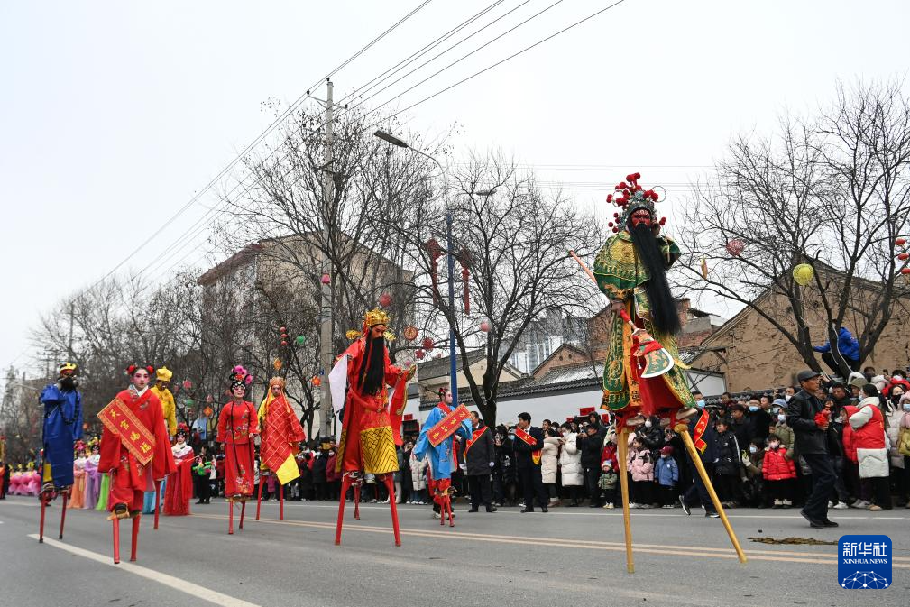2月12日,步社火演员在陇县元宵节社火巡游活动上表演。