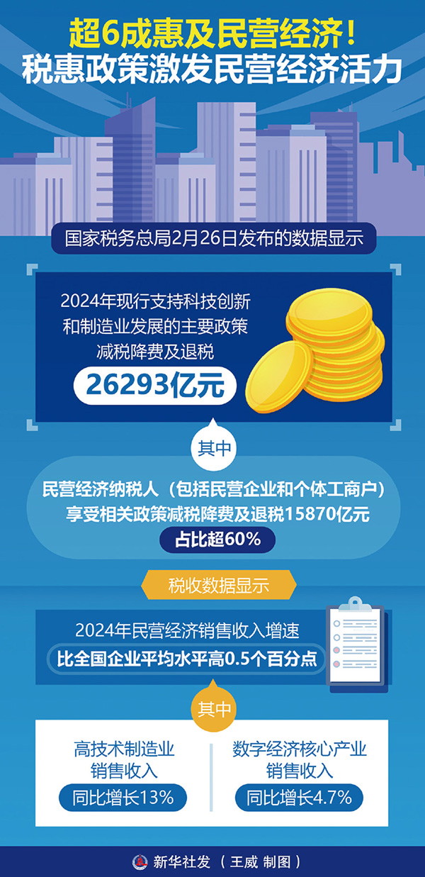 党的十八大以来,各地区各部门从减税降费、市场准入、融资支持等方面出台系列政策举措,有力促进民营经济发展壮大。根据国家税务总局2025年2月26日发布的数据,2024年现行支持科技创新和制造业发展的税惠政策超六成惠及民营经济。 新华社发 王威/制图
