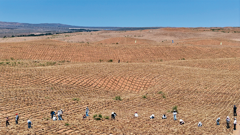 2025年6月30日,腾格里沙漠东南缘治沙锁边工程在宁夏境内实现全面“锁定”。该工程对遏制腾格里沙漠扩张、保护黄河安澜、改善区域生态环境、促进当地经济社会可持续发展具有重要意义。图为6月30日在宁夏中卫市长流水村拍摄的工程现场。 新华社记者 王鹏/摄