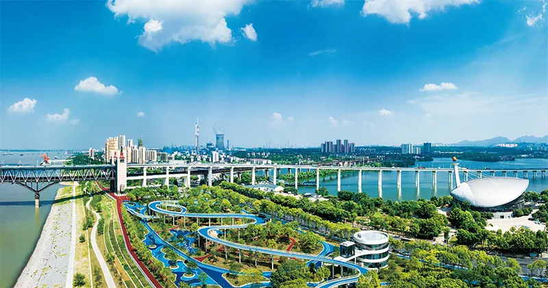 绿色是高质量发展的鲜明底色。近年来,江西省九江市坚持“还江于民、便民利民,生态优先、文化铸魂”原则,积极推进城市滨江绿地建设。图为2023年7月8日,长江国家文化公园九江城区段。 石小龙/摄