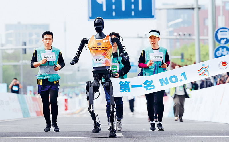 图为2025年4月19日,在北京亦庄半程马拉松暨人形机器人半程马拉松比赛中,机器人选手“天工”(左二)率先冲过终点。 北京经济技术开发区宣传文化部供图