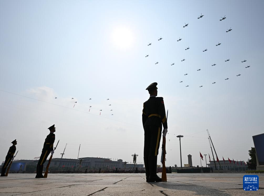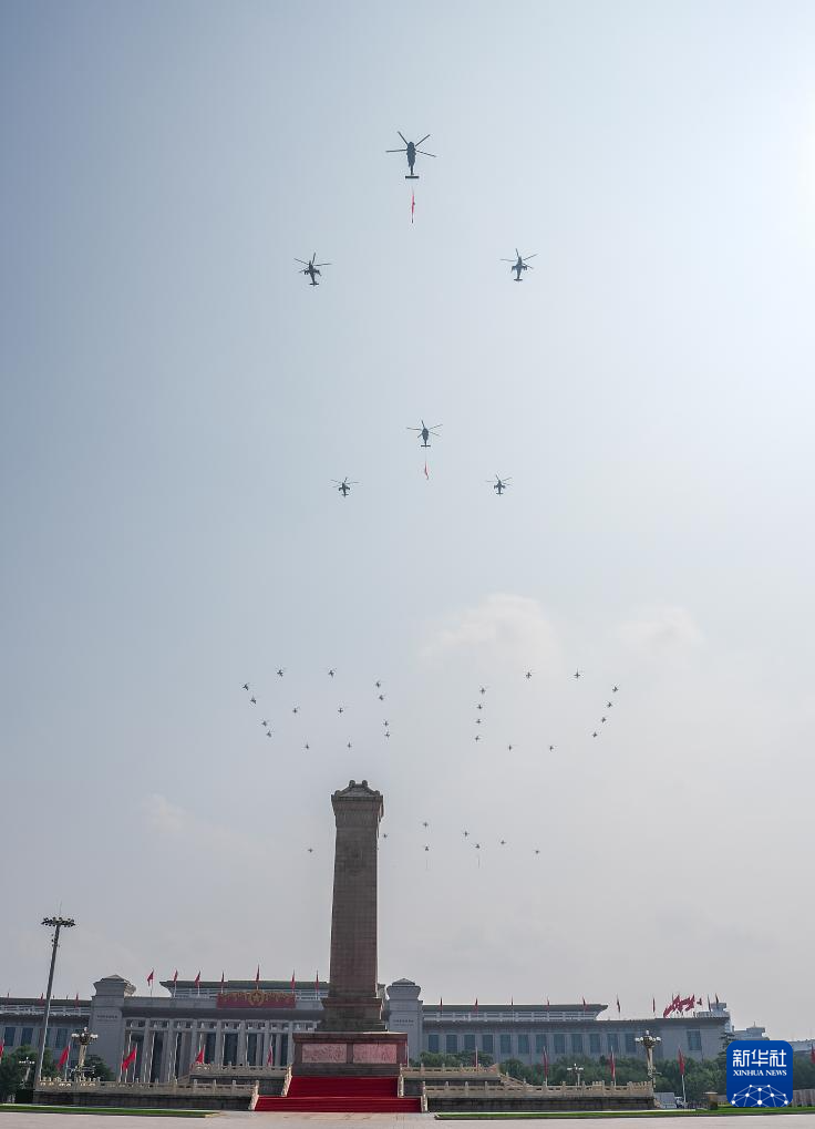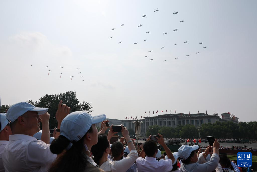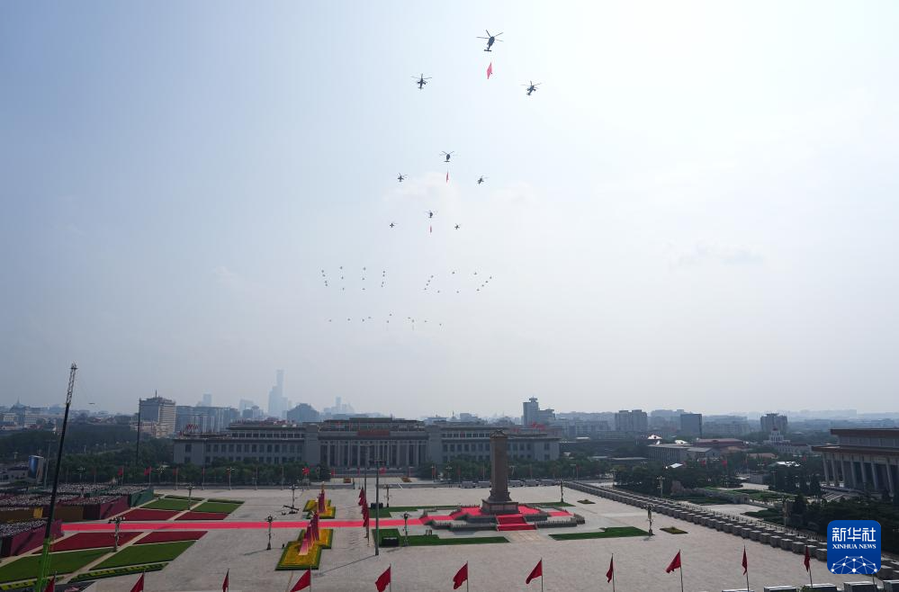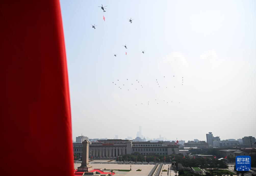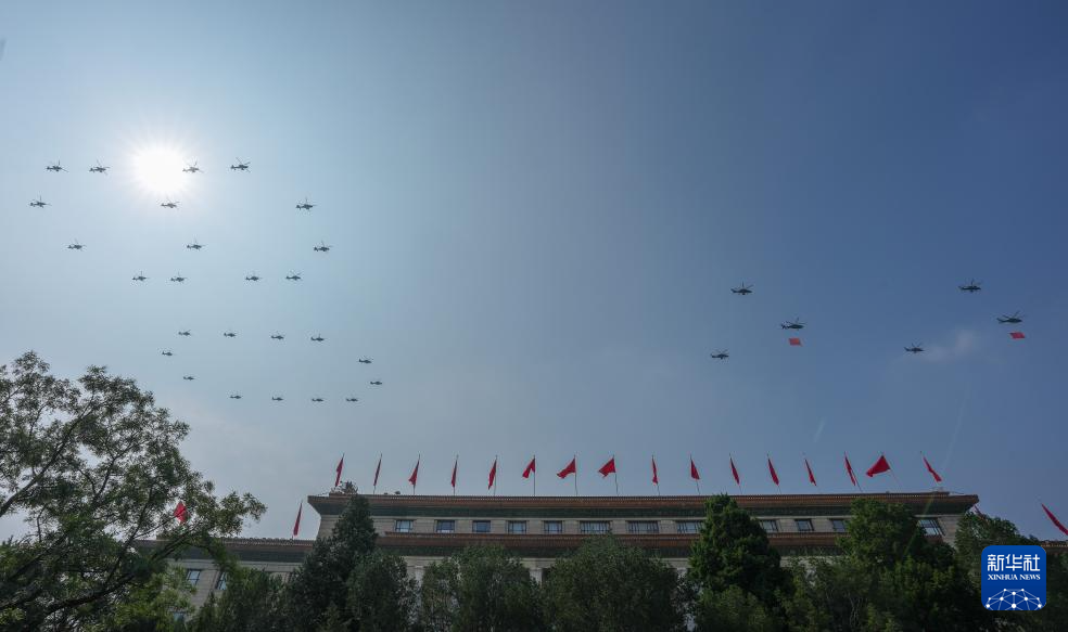 9月3日,纪念中国人民抗日战争暨世界反法西斯战争胜利80周年大会在北京隆重举行。这是空中护旗梯队通过天安门广场。