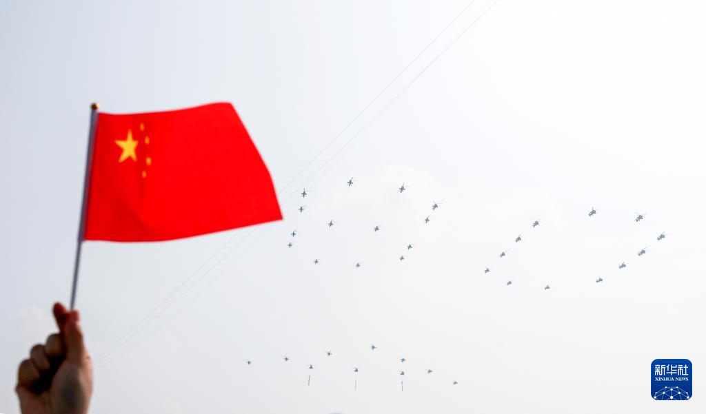 9月3日,纪念中国人民抗日战争暨世界反法西斯战争胜利80周年大会在北京隆重举行。这是空中护旗梯队。