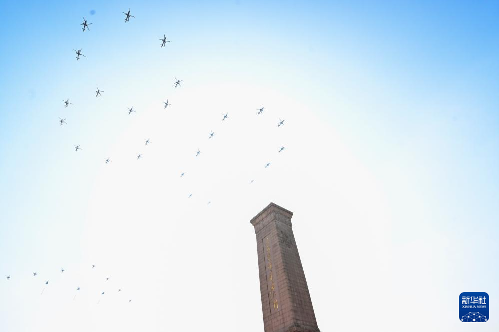 9月3日,纪念中国人民抗日战争暨世界反法西斯战争胜利80周年大会在北京隆重举行。这是空中护旗梯队飞过天安门广场上空,26架直升机汇成巨大的“80”字样。