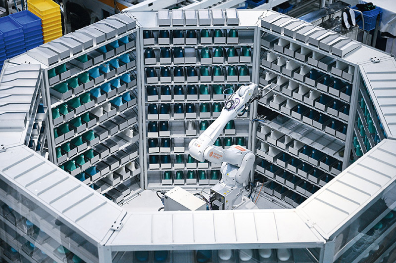 在福建莆田的定制工厂,消费者只需脱下鞋袜、站上专用设备,面前的屏幕便会即时显示足长、足宽、足弓高度等多维脚型数据。基于这些数据,系统将自动生成个人专属鞋款定制模板,消费者随后可自主选择心仪的样式与花色。门店内的智能化流水生产线随即启动,直接进行个性化生产。最快仅需一个多小时,一双为消费者“量身打造”的新鞋即可打包带走。图为2025年8月19日在福建莆田一家定制工厂拍摄的一台高效运转的机械臂。 新华社记者 周义/摄