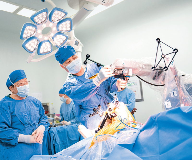 近年来,各地不断丰富医疗卫生领域应用场景,推动大数据、物联网、人工智能等技术赋能医疗服务。图为2024年10月17日,在江苏省南通市一家医院,医生们在智能机器人辅助下操作膝关节双间室置换术。 人民图片 翟慧勇/摄