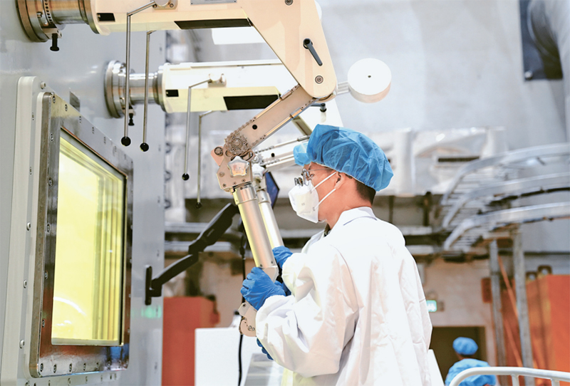 2025年,位于甘肃民勤的2兆瓦液态燃料钍基熔盐实验堆已成功实现国际首次钍铀核燃料转换,成为目前国际上唯一运行且实现钍燃料入堆的熔盐堆,为我国未来规模化开发利用钍资源、发展第四代先进核能系统提供核心技术支撑与可行方案。图为2025年10月24日,在中国科学院上海应用物理研究所武威园区,科研人员在2兆瓦液态燃料钍基熔盐实验堆加料—取样热室工作。 新华社记者 张建松/摄