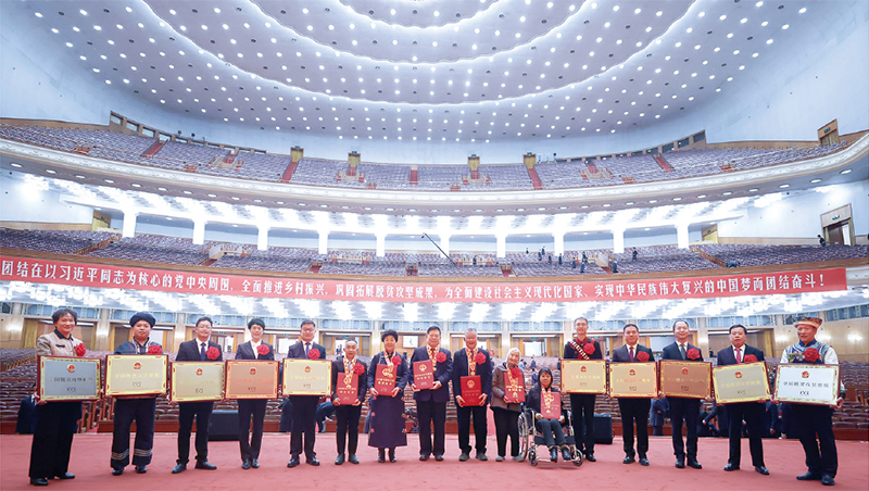 在波澜壮阔的脱贫攻坚伟大实践中,涌现出一批政治坚定、表现突出、贡献重大、精神感人的杰出典型。他们的事迹,生动诠释了中国人民改革创新、攻坚克难的精神风貌,充分反映了共产党人不忘初心的使命担当和全心全意为人民谋幸福的深厚情怀。图为2021年2月25日,参加全国脱贫攻坚总结表彰大会的“全国脱贫攻坚楷模”荣誉称号获得者在会后合影留念。 新华社记者 鞠鹏/摄
