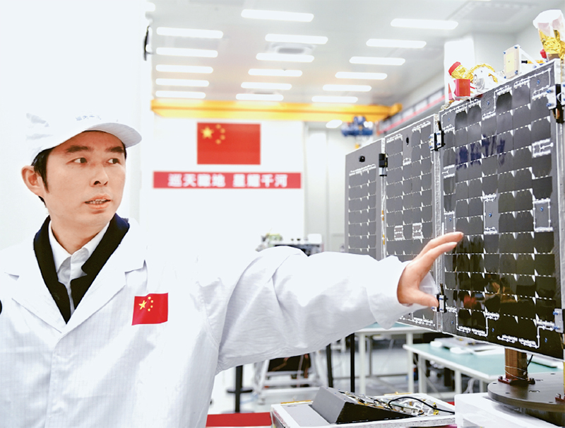 卫星互联网作为6G通信技术的核心组成部分,不仅是构建空天地一体化网络、实现万物广泛互联的关键技术基石,更是驱动新质生产力跃升的重要引擎。图为2026年3月17日,在上海G60卫星互联网产业基地,一家公司工作人员介绍卫星太阳翼产品。 新华社记者 张建松/摄