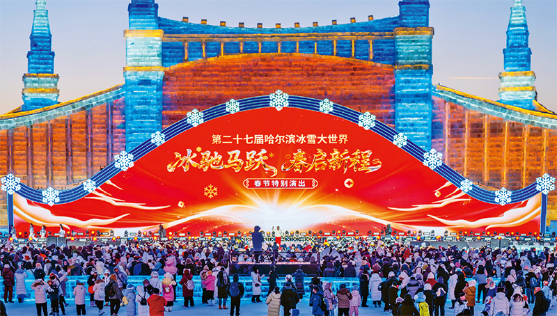 2026年2月16日,除夕之夜,在春节联欢晚会分会场哈尔滨冰雪大世界,晶莹剔透的梦幻大舞台灯光璀璨,精彩演出轮番上演,游客们在冰天雪地中欢度佳节。 中新社发 池世永/摄