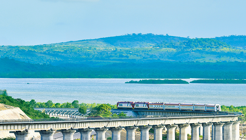 由中國承建的蒙巴薩-內(nèi)羅畢標軌鐵路(蒙內(nèi)鐵路)全長約480公里,于2017年5月通車。圖為2017年5月29日,一列肯尼亞蒙內(nèi)鐵路測試列車行駛在蒙巴薩特大橋上。 新華社記者 孫瑞博/攝