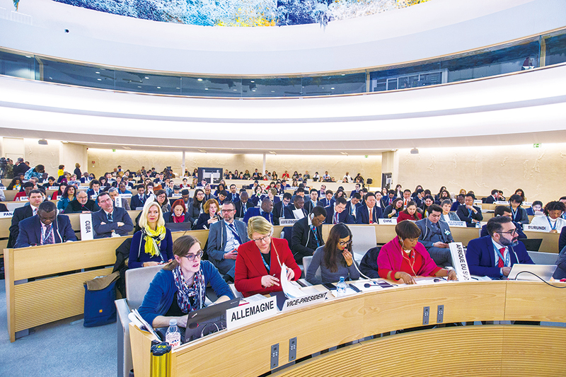 2018年3月23日,在瑞士舉行聯(lián)合國人權(quán)理事會第37屆會議。會議通過中國提出的“在人權(quán)領(lǐng)域促進(jìn)合作共贏”決議,第一次同時把推進(jìn)構(gòu)建人類命運共同體,推進(jìn)構(gòu)建相互尊重、公平正義、合作共贏的新型國際關(guān)系寫入聯(lián)合國的文件。這是繼2017年3月17日構(gòu)建人類命運共同體理念首次載入聯(lián)合國安理會決議后,中國理念回聲再起,體現(xiàn)了這一理念已經(jīng)得到廣大會員國的普遍認(rèn)同。圖為會議現(xiàn)場。 新華社記者 徐金泉/攝