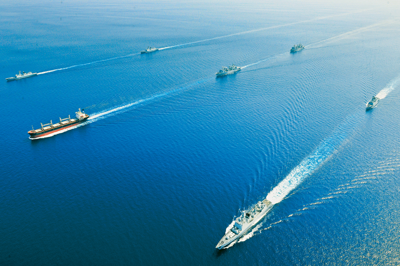 從2008年至今,31批中國(guó)海軍護(hù)航編隊(duì)相繼赴亞丁灣護(hù)航,有力保障了國(guó)際重要貿(mào)易航道的安全。圖為2015年4月22日中國(guó)海軍第20批護(hù)航編隊(duì)在護(hù)航中。 海蘭/視覺中國(guó)