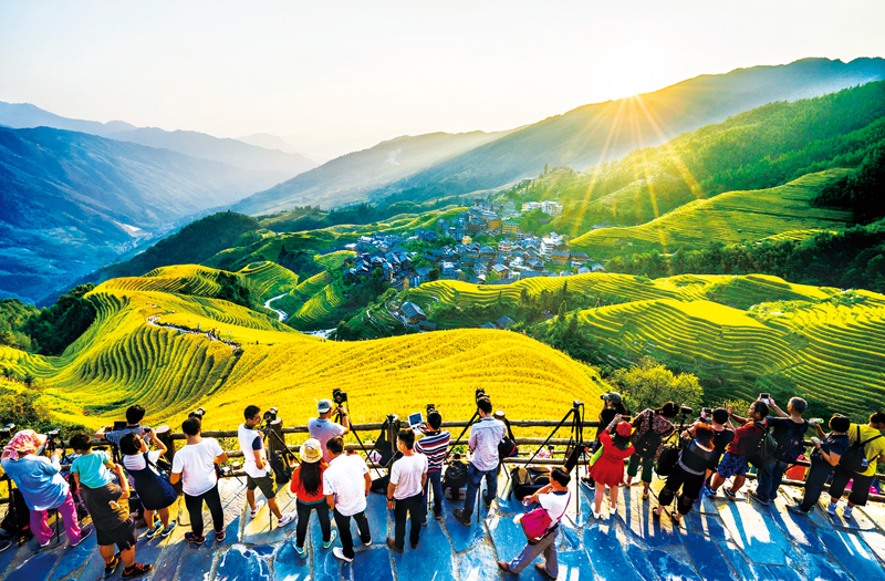 生態(tài)旅游成為新型產(chǎn)業(yè)。桂林市龍勝各族自治縣以加快實(shí)現(xiàn)“中國生態(tài)旅游強(qiáng)縣”為目標(biāo),逐步形成生態(tài)、旅游、扶貧三位一體的扶貧大格局。圖為國慶黃金周期間大量游客在龍脊梯田景區(qū)觀賞金秋美景。 人民網(wǎng)廣西頻道供圖