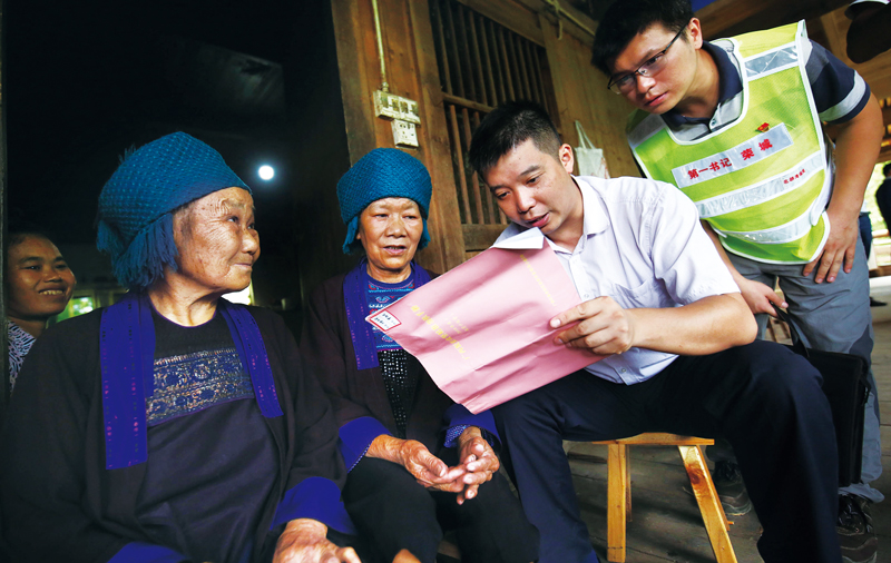 “幫錢幫物,不如幫助建個好支部。”脫貧攻堅(jiān)工作開展在基層,服務(wù)在基層,成效也在基層。廣西許多駐村第一書記穿起印有名字和職務(wù)的馬甲,方便群眾熟識。圖為柳州市融水苗族自治縣大浪鎮(zhèn)大新村整架苗寨,扶貧干部和駐村第一書記向苗族貧困戶了解收入情況。 龍林智/攝