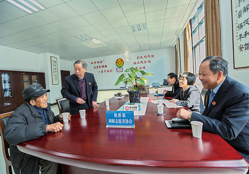 上個世紀(jì)60年代初,浙江諸暨楓橋通過發(fā)動和依靠群眾,堅持小事不出村、大事不出鎮(zhèn)、矛盾不上交,就地化解矛盾,實現(xiàn)了“捕人少,治安好”,創(chuàng)造了“楓橋經(jīng)驗”。多年來,“楓橋經(jīng)驗”展現(xiàn)出歷久彌新的魅力,成為全國政法綜治戰(zhàn)線的一面旗幟。圖為諸暨市楓橋鎮(zhèn)楓源村調(diào)解志愿者聯(lián)合會接待室,調(diào)解志愿者正在為與鄰居產(chǎn)生矛盾的村民調(diào)解,一番耐心解釋,這位村民消除了誤會,滿意而歸。 中央政法委宣教局供圖