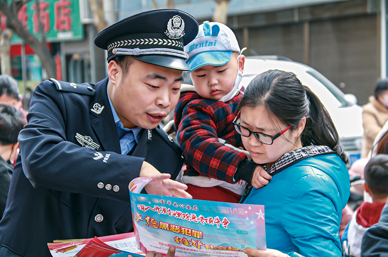為保障人民安居樂業(yè)、社會安定有序、國家長治久安,進(jìn)一步鞏固黨的執(zhí)政基礎(chǔ),政法機關(guān)在全國開展了掃黑除惡專項斗爭。 圖為2019年3月13日,陜西省富平縣公安局舉行掃黑除惡專項斗爭“入百店千家萬戶”集中宣傳活動,通過張貼海報、播放專題短片、發(fā)放宣傳資料等形式,向居民宣傳普及掃黑除惡相關(guān)法律知識和政策,征集涉黑涉惡案件線索。 中央政法委宣教局供圖