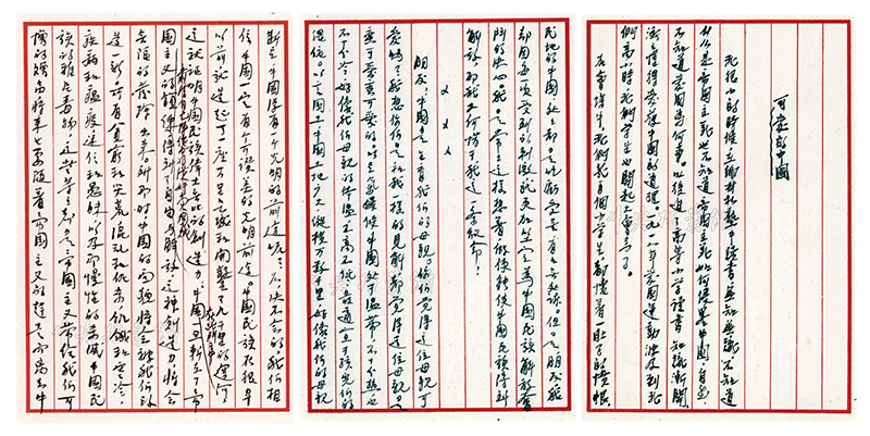 今年是方志敏誕辰120周年。他被捕入獄后,仍不忘“愛護(hù)中國,拯救中國的問題”,并在極其艱難的條件下,撰寫了《可愛的中國》這一不朽之作,文章結(jié)尾表明了一個即將赴敵人刑場的革命愛國志士的氣概:“假如我還能生存,那我生存一天就要為中國呼喊一天”。圖為《可愛的中國》部分手稿,字里行間流露出濃濃的愛國情懷。 中央檔案館供圖