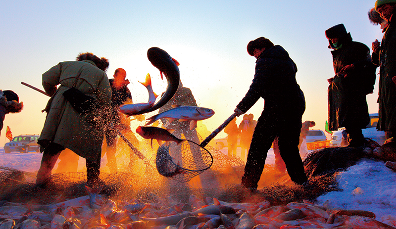 說(shuō)到此處,張文側(cè)過頭來(lái)神秘地笑了一下:“你看,總書記的祝福當(dāng)年就兌現(xiàn)了。今年查干湖冬捕收獲最大,比歷年都好。就在前天,我們打到了歷史上最大的一個(gè)“紅網(wǎng)”,一網(wǎng)打上來(lái)差不多60萬(wàn)斤魚;昨天特意往魚少的地方挪了挪窩兒,還打上來(lái)40萬(wàn)斤,庫(kù)里都堆滿了。個(gè)頭兒也比往年大了不少。往年上來(lái)的胖頭魚多數(shù)在15斤左右,今年卻多數(shù)是18斤左右。如果不出意外的話,今年的銷售,至少能比去年提高兩位數(shù)?!?/p>