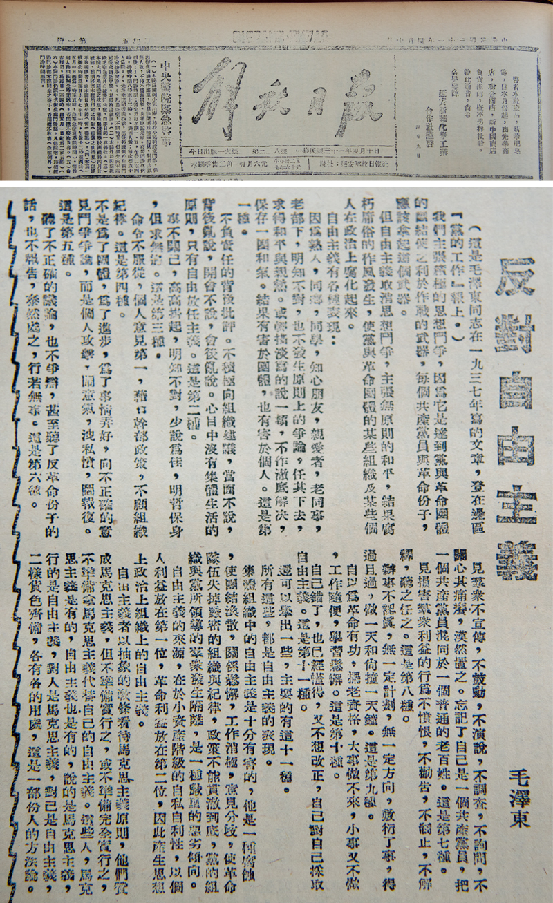 毛澤東同志《反對自由主義》于1937年9月發(fā)表在中國人民抗日軍政大學內部校刊《思想戰(zhàn)線》,并在1942年4月10日的《解放日報》公開發(fā)表。圖為當時的《解放日報》。