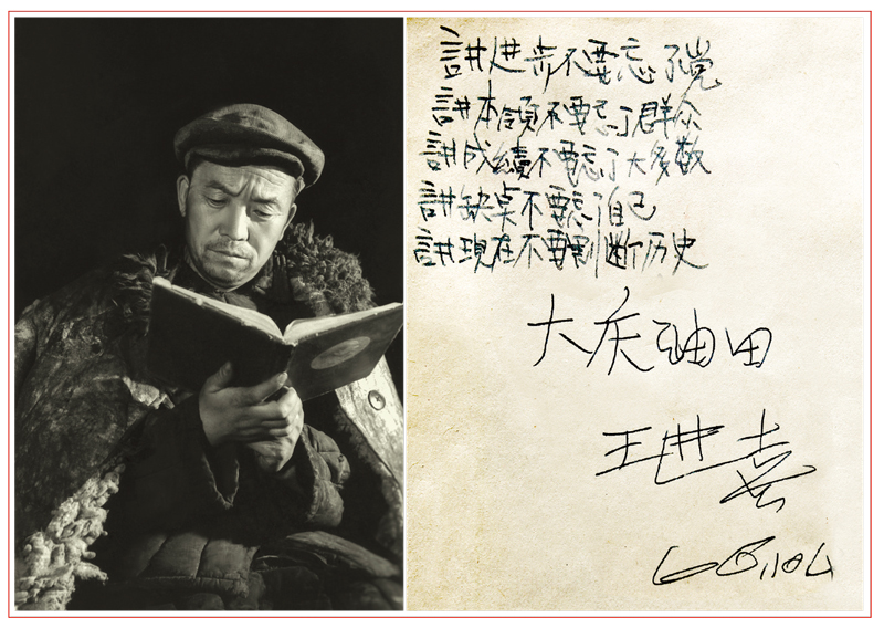 王進(jìn)喜是中國石油工人的光輝典范,是中國共產(chǎn)黨人的優(yōu)秀楷模,給我們留下了寶貴的精神財富——鐵人精神。左圖為1960年4月10日,石油工業(yè)部機(jī)關(guān)黨委做出了關(guān)于學(xué)習(xí)毛澤東同志所著《實(shí)踐論》和《矛盾論》的決定,王進(jìn)喜積極響應(yīng)會戰(zhàn)黨委的號召,帶領(lǐng)職工學(xué)習(xí)“兩論”。右圖是1966年國慶期間,鐵人王進(jìn)喜應(yīng)邀到北京人民藝術(shù)劇院作報告時,演員李光復(fù)請他在毛主席語錄扉頁上寫下“五講”留言簽名。 鐵人王進(jìn)喜紀(jì)念館供圖