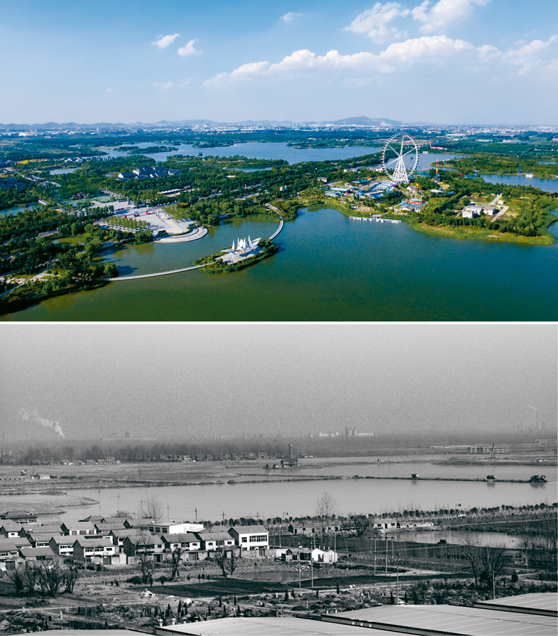 “不要污染的GDP”,向落后產(chǎn)能宣戰(zhàn),成為江蘇高質(zhì)量發(fā)展的鮮明導(dǎo)向。位于江蘇省徐州市賈汪區(qū)的馬莊村曾是一個(gè)典型的采煤村,因過度開采,該村周邊一度是徐州最大的采煤塌陷區(qū)。近年來,當(dāng)?shù)叵聸Q心治理生態(tài)環(huán)境,將村旁的潘安采煤塌陷區(qū)改造為潘安湖國(guó)家濕地公園。上圖為美麗的潘安湖國(guó)家濕地公園,下圖為馬莊村舊貌。 新華日?qǐng)?bào)社供圖