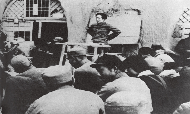 毛澤東非常重視理論聯(lián)系實(shí)際這一馬克思主義學(xué)風(fēng)的養(yǎng)成,強(qiáng)調(diào)必須始終堅(jiān)持把馬克思主義與中國實(shí)際緊密結(jié)合起來。圖為毛澤東在為陜北公學(xué)學(xué)員講課。