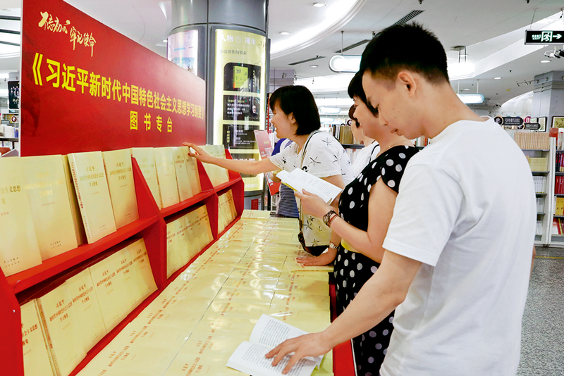 2019年6月,中共中央發(fā)出關(guān)于印發(fā)《習(xí)近平新時代中國特色社會主義思想學(xué)習(xí)綱要》的通知,要求各級黨委緊密結(jié)合“不忘初心、牢記使命”主題教育,把《綱要》納入學(xué)習(xí)計劃,作出周密安排,開展多形式、分層次、全覆蓋的學(xué)習(xí)培訓(xùn)。圖為讀者在西單圖書大廈喜讀《綱要》。 徐瑾/攝