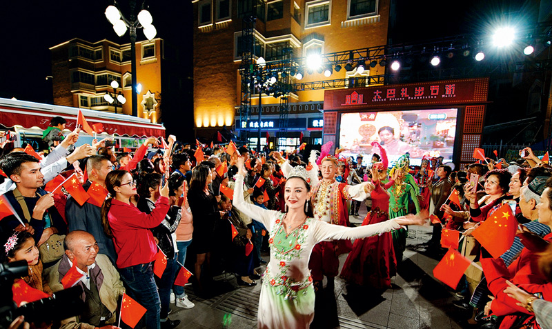 新疆國際大巴扎是新疆商業(yè)與旅游繁榮的象征,集建筑、民族商貿(mào)、娛樂、餐飲于一體,是新疆旅游業(yè)產(chǎn)品的匯集地和展示中心,是“新疆之窗”。圖為2018年10月1日,在烏魯木齊新疆國際大巴扎步行街,歌舞演員和游客一起載歌載舞,歡度國慶。 新疆維吾爾自治區(qū)黨委宣傳部供圖