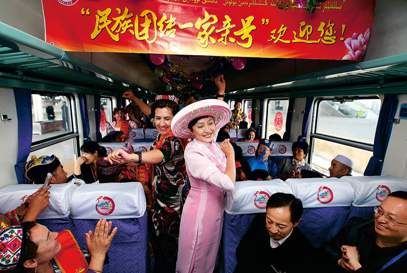 2017年,新疆開通從烏魯木齊到和田、從北疆到南疆的特快旅客列車“民族團結(jié)一家親號”,架起了一座各民族群眾交往交流交融的“連心橋”。圖為2017年4月11日,各族旅客從高鐵新客站乘坐“民族團結(jié)一家親號”專列出發(fā),大家在車上跳起了麥西來甫。 新疆維吾爾自治區(qū)黨委宣傳部供圖