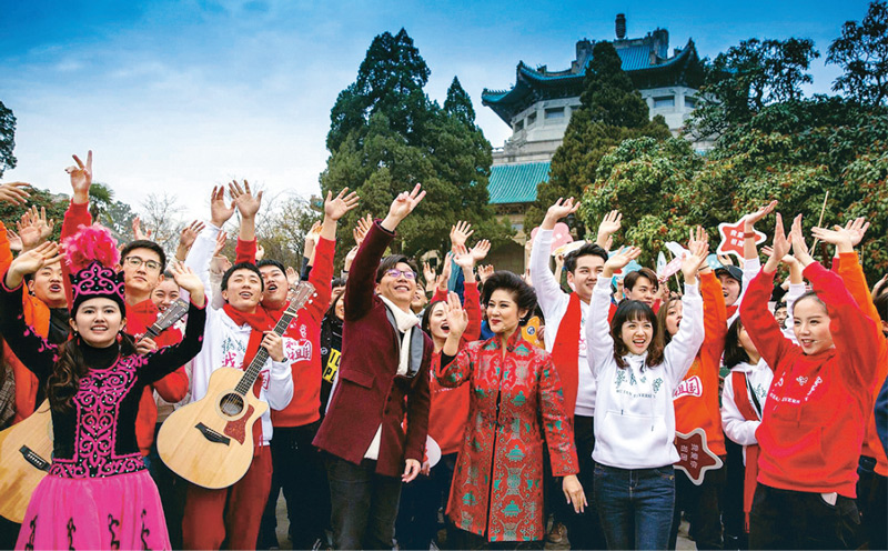 2018年歲末,千余名武漢大學(xué)師生登上櫻園老齋舍,用快閃唱響《我和我的祖國》,表達(dá)當(dāng)代年輕學(xué)子的愛國之情。 武漢大學(xué) 王志敏/攝