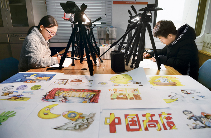 南京航空航天大學(xué)利用“一分鐘”微視頻方式,通過簡筆漫畫和詼諧幽默的語言在大約一分鐘的時(shí)間內(nèi)講解各種時(shí)事熱點(diǎn)、航天知識(shí)、校園政策,傳播主流價(jià)值,開展思想政治教育,受到學(xué)生歡迎。圖為“一分鐘”微視頻團(tuán)隊(duì)的學(xué)生在繪制簡筆漫畫。 新華社記者 馬寧/攝
