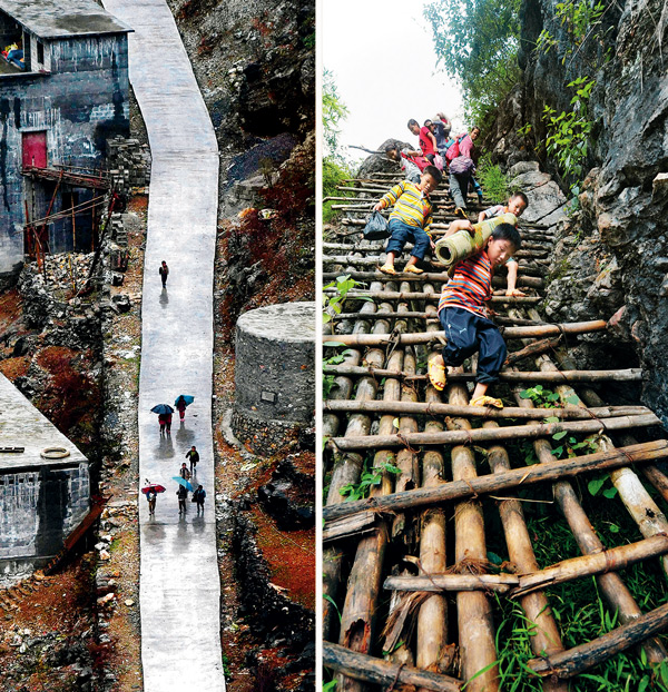 隨著脫貧攻堅(jiān)工作的深入推進(jìn),原本“千重山,萬(wàn)層嶺,不通水,不通電”的廣西大石山區(qū)發(fā)生了翻天覆地的變化。右圖為廣西大化瑤族自治縣板升鄉(xiāng)弄勇村弄頂屯的孩子們,在陡峭的小道上扛著生活用具去學(xué)校(2012年9月3日攝),左圖為已從學(xué)校修通到家門(mén)口的水泥路(2017年1月11日攝)。 新華社記者 黃孝邦/攝