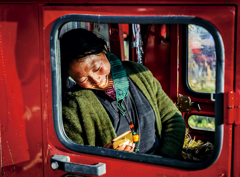 發(fā)展旅游越來越成為少數(shù)民族地區(qū)脫貧致富的重要方式。圖為2018年10月的一天,四川稻城,一位街邊賣藏族手工藝品的藏族婦女,接待完游客后,在小機動車駕駛室里查看手機信息,露出幸福的笑容。 視覺中國 邵小峰/攝