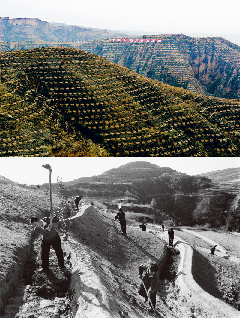 位于呂梁山區(qū)深處的臨汾市大寧縣,地處黃土高原殘垣溝壑區(qū),是國家深度貧困縣,又是限制開發(fā)的國家生態(tài)建設(shè)區(qū)。近年來,大寧深入貫徹落實習(xí)近平生態(tài)文明思想,創(chuàng)新實施“購買式造林”,生態(tài)環(huán)境大幅改善,在一個戰(zhàn)場同時打贏了生態(tài)治理和脫貧攻堅兩場攻堅戰(zhàn)。上圖為“綠荒山、富百姓、惠民生”的大規(guī)模造林場景(李明珠/攝)。下圖為上世紀(jì)90年代大寧縣農(nóng)民在田間勞作(新華社記者 馬毅敏/攝)。