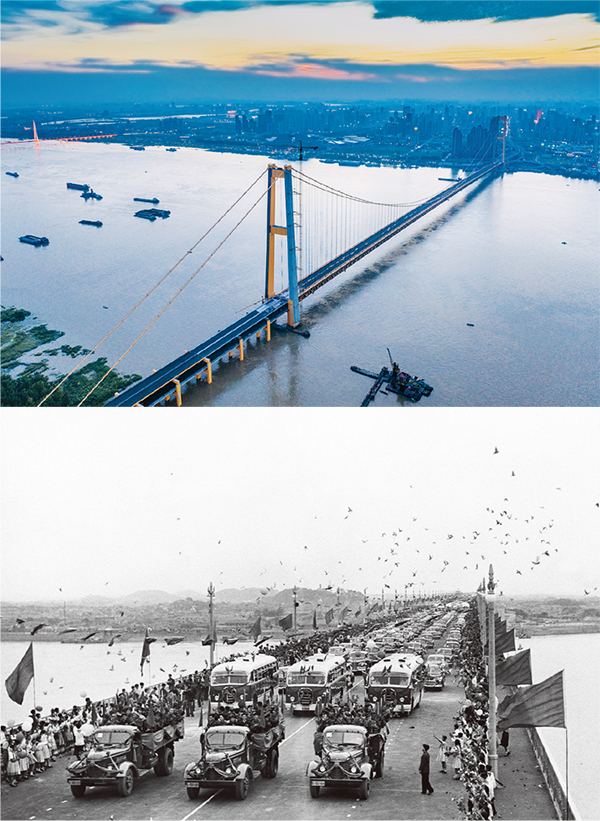橋梁連接五湖四海,見證歷史滄桑。新中國(guó)成立以來(lái),一座座中國(guó)橋記錄了發(fā)展奇跡。武漢長(zhǎng)江大橋是新中國(guó)成立后修建的第一座公路和鐵路兩用的長(zhǎng)江大橋,素有“萬(wàn)里長(zhǎng)江第一橋”美譽(yù)。今天,中國(guó)橋梁建設(shè)已經(jīng)達(dá)到世界領(lǐng)先水平,中國(guó)橋享譽(yù)世界。上圖為楊泗港長(zhǎng)江大橋,這已是武漢第十座長(zhǎng)江大橋,也是世界最大跨度雙層懸索橋,該橋于2019年9月21日通車運(yùn)營(yíng)(中新社發(fā) 趙廣亮/攝)。下圖為1957年10月15日,披綢掛彩的汽車隊(duì)在萬(wàn)眾歡呼聲中駛過(guò)武漢長(zhǎng)江大橋(新華社記者 李九齡/攝)。