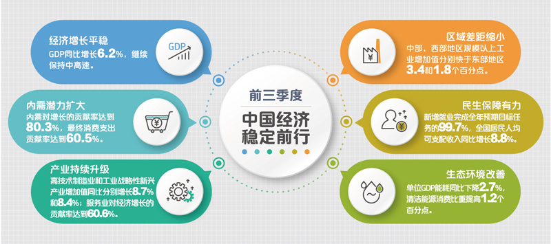 2019年前三季度,我國主要宏觀指標(biāo)處于合理區(qū)間,經(jīng)濟(jì)發(fā)展“大盤”穩(wěn)定,結(jié)構(gòu)調(diào)整穩(wěn)步推進(jìn),“六大特征”顯示經(jīng)濟(jì)穩(wěn)定前行。 曾琦/制圖