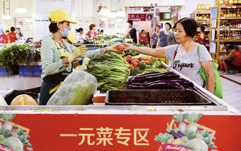 “菜籃子”涉及千家萬戶,是保障和改善民生的重要內(nèi)容。圖為2019年9月11日,在??谑薪鹳Q(mào)文華農(nóng)貿(mào)市場,市民在“菜籃子”平價(jià)菜直營攤位選購蔬菜。 新華社記者 楊冠宇/攝