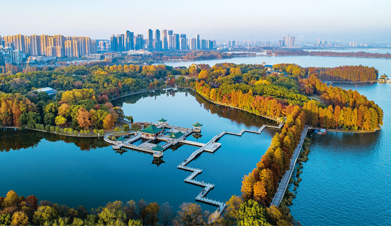 長江是湖北省經(jīng)濟發(fā)展的“黃金主軸”。目前,湖北省正以系統(tǒng)性舉措推進山水林田湖草一體化修復(fù),實施長江防護林建設(shè)、水土流失治理、河湖濕地保護等一批生態(tài)重點工程,優(yōu)化長江生態(tài)環(huán)境,持續(xù)改善長江水質(zhì),積極探索綠水青山轉(zhuǎn)化為金山銀山路徑,著力打造一條全新的綠色生態(tài)廊道,筑牢長江中游重要“生態(tài)屏障”。圖為無人機拍攝的湖北省武漢市東湖綠道。 新華社記者 肖藝九/攝