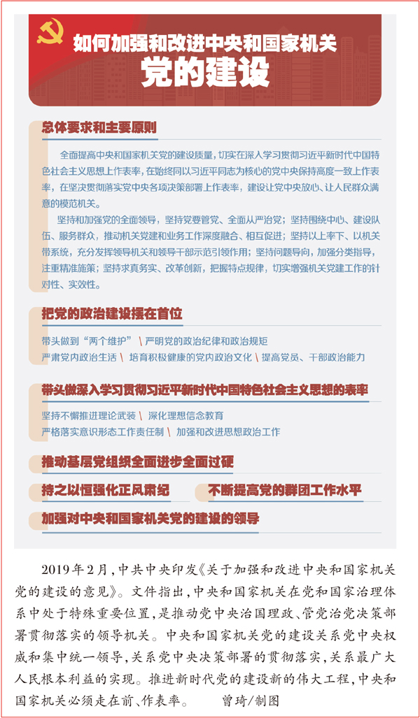 黨的十八大以來,習(xí)近平總書記就加強(qiáng)中央和國家機(jī)關(guān)黨的建設(shè)作出一系列重要論述和重大部署。2013年6月,總書記在全國組織工作會議上指出:“各級領(lǐng)導(dǎo)機(jī)關(guān)和領(lǐng)導(dǎo)干部,尤其是中央機(jī)關(guān)和中央國家機(jī)關(guān)、高級領(lǐng)導(dǎo)干部要強(qiáng)化帶頭意識,時時處處嚴(yán)要求、作表率?!?014年5月,他對中辦工作提出“五個堅持”的要求,即堅持絕對忠誠的政治品格、堅持高度自覺的大局意識、堅持極端負(fù)責(zé)的工作作風(fēng)、堅持無怨無悔的奉獻(xiàn)精神、堅持廉潔自律的道德操守。2016年1月,在第十八屆中央紀(jì)委六次全會上,他強(qiáng)調(diào)強(qiáng)化黨內(nèi)監(jiān)督,首先要把中央和國家機(jī)關(guān)管好。2018年3月,在深化黨和國家機(jī)構(gòu)改革中,黨中央組建中央和國家機(jī)關(guān)工委,進(jìn)一步加強(qiáng)了對中央和國家機(jī)關(guān)黨的建設(shè)的集中統(tǒng)一領(lǐng)導(dǎo)。2018年7月,總書記就推進(jìn)中央和國家機(jī)關(guān)黨的政治建設(shè)作出重要指示,強(qiáng)調(diào)中央和國家機(jī)關(guān)首先是政治機(jī)關(guān),必須旗幟鮮明講政治。2019年2月,黨中央制定出臺《關(guān)于加強(qiáng)和改進(jìn)中央和國家機(jī)關(guān)黨的建設(shè)的意見》,對加強(qiáng)中央和國家機(jī)關(guān)黨的建設(shè)作出全面部署。在習(xí)近平總書記一系列重要論述的指引下、在黨中央一系列重大舉措的推動下,黨的十八大以來中央和國家機(jī)關(guān)黨的建設(shè)取得了顯著成績。