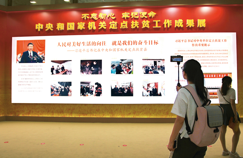 黨的十八大以來,中央和國家機(jī)關(guān)各部門把定點(diǎn)扶貧工作作為重大政治任務(wù),盡銳出戰(zhàn),擔(dān)當(dāng)作為,為打贏脫貧攻堅戰(zhàn)作出了貢獻(xiàn)。2019年8月16日至21日,由中央和國家機(jī)關(guān)工委主辦的“不忘初心、牢記使命——中央和國家機(jī)關(guān)定點(diǎn)扶貧工作成果展”在京展出。圖為展覽現(xiàn)場。 視覺中國供圖