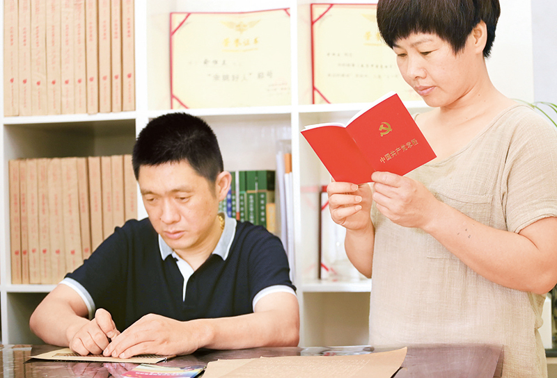 黨的十九大根據(jù)形勢任務(wù)發(fā)展變化,吸收黨的理論創(chuàng)新和實(shí)踐創(chuàng)新成果,對(duì)《中國共產(chǎn)黨章程》進(jìn)行修改完善,實(shí)現(xiàn)了黨的根本大法的與時(shí)俱進(jìn)。圖為浙江省余姚市陽明街道黨員、盲人按摩師俞恒立,在妻子的幫助下將黨章刻為盲文,便于日常學(xué)習(xí)。 人民出版社供圖
